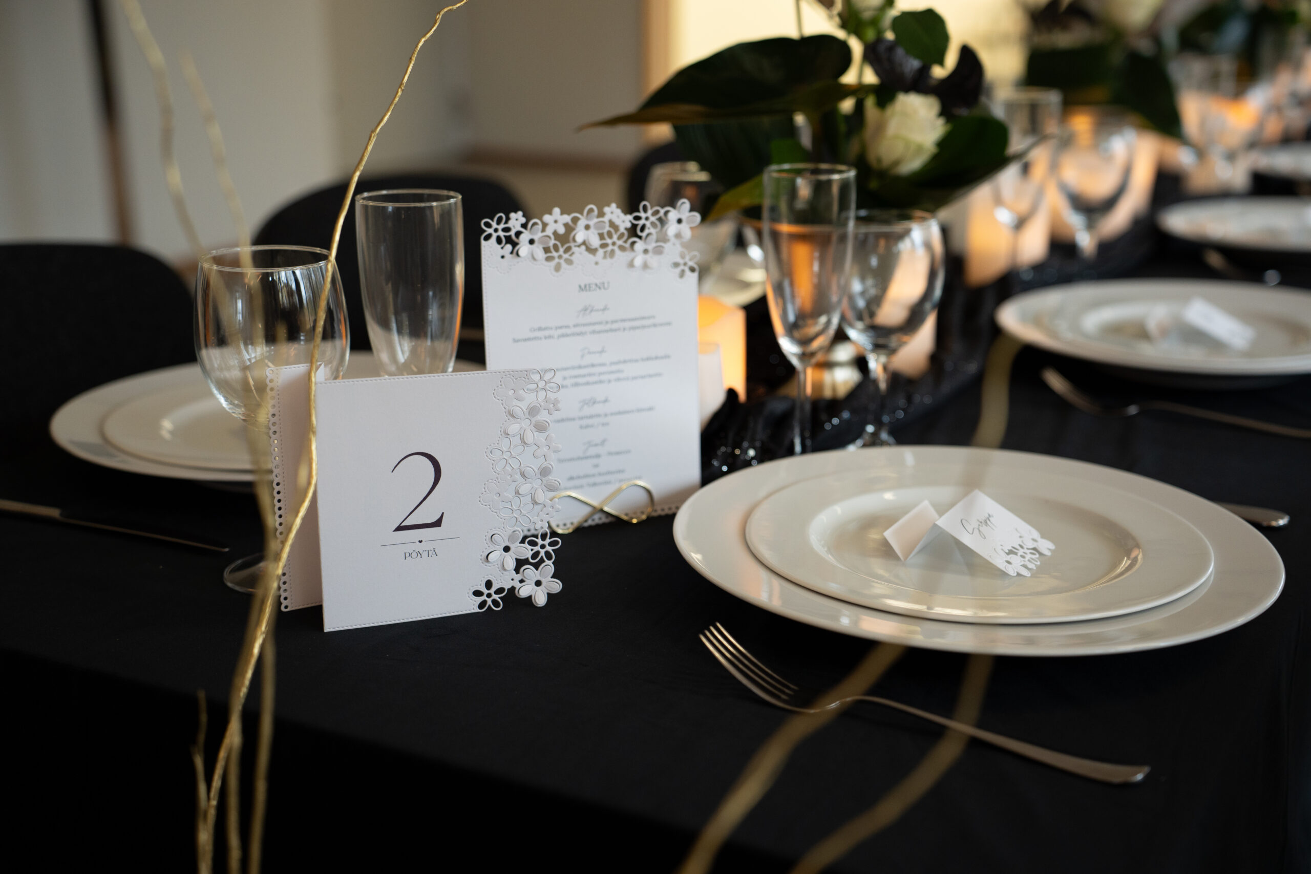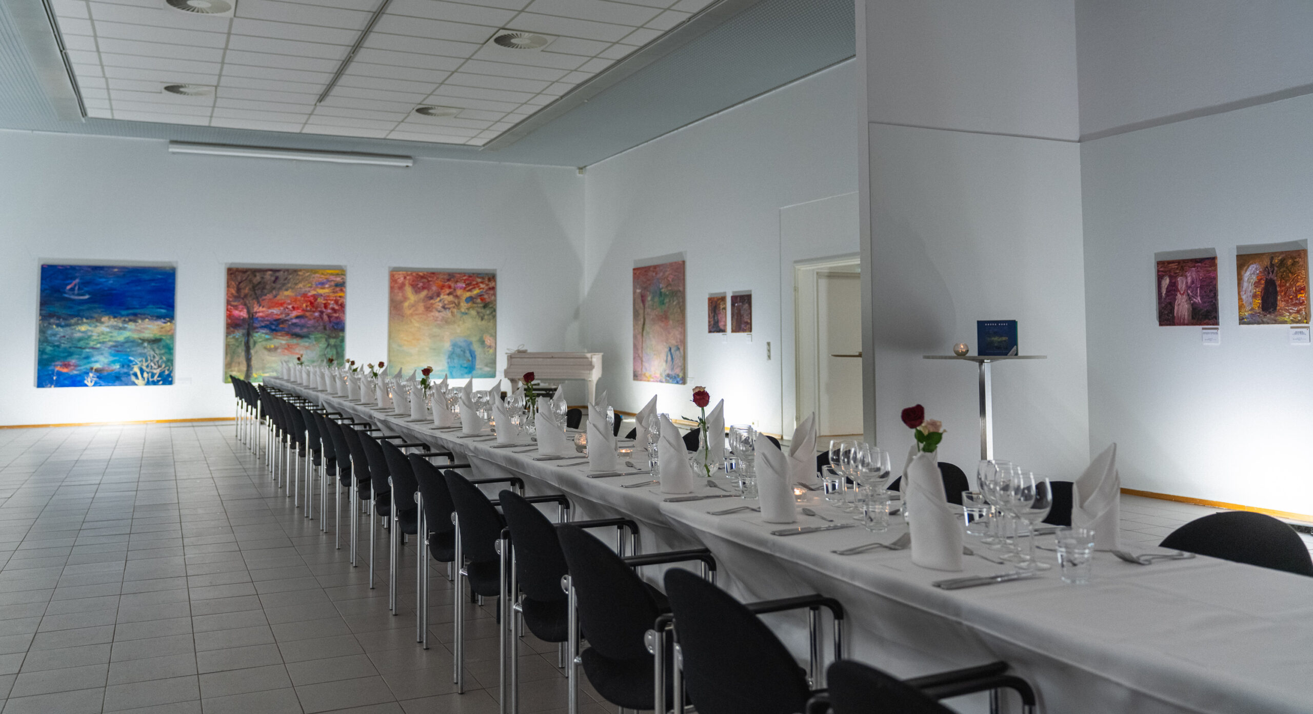 Meilahden Taidehallissa illallinen järjestetään vaihtuvan taidenäyttelyn keskellä. Tunnelmavalaistus ja näyttelykokonaisuus luovat tilaisuuteen ainutlaatuisen ympäristön, joka toimii elämyksenä jo sellaisenaan.